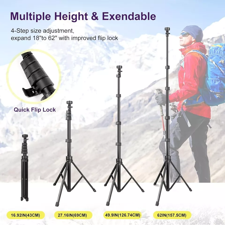 Extendable Legs: The tripod legs extend up to 62 inches (about 157.5 cm), providing adjustable height to capture different perspectives and angles.