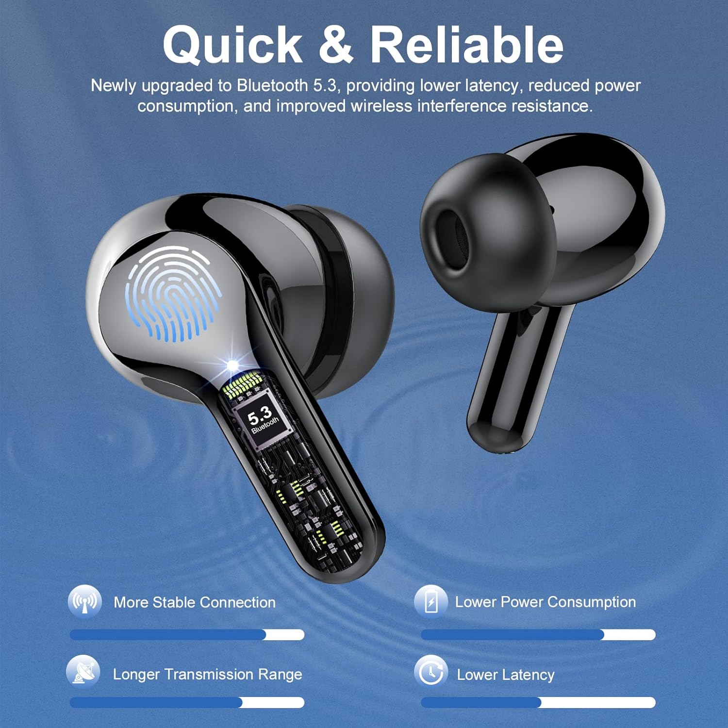 Cutting-Edge Bluetooth 5.3 and Effortless Pairing: Thanks to the advanced Bluetooth 5.3 capabilities, the bluetooth earbuds transmission range of up to 30 feet, ensures a more stable connection, shorter delay, and lower energy consumption during data transmission. This wireless earbuds has a built-in hall effect switch, the first time you turn them on, the wireless earphones automatically go into pairing mode, then they automatically pair with the last device you used.
