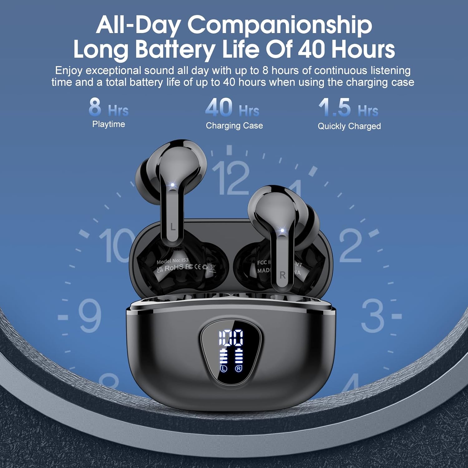 Upgraded 40H Playtime and LED Power Display: A single charge of the I53 bluetooth earphones provides 8 hours of playback, the stylish and compact charging case provides an extended charge when you need it, up to 40 hours of playtime. The dual LED battery indicators on the charging case keep you informed about the status of both the wireless headphones and the charging case. USB-C charging port ensures faster and safer charging, ensuring a day-long musical experience.