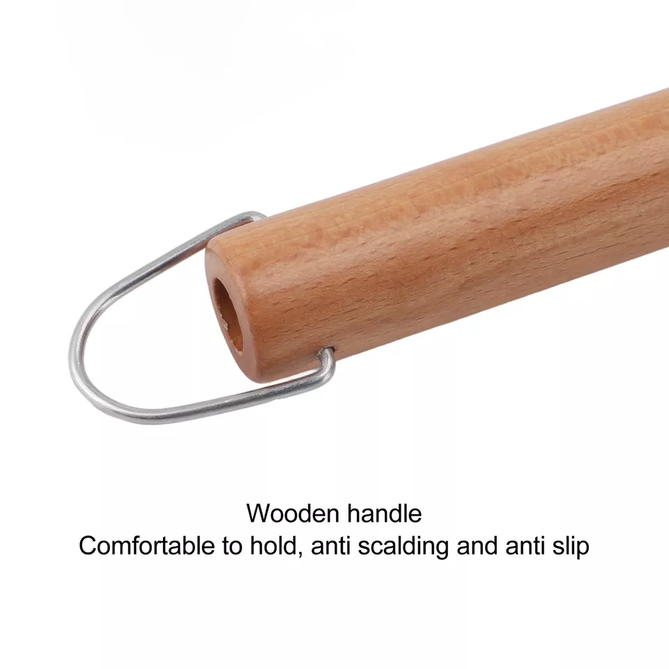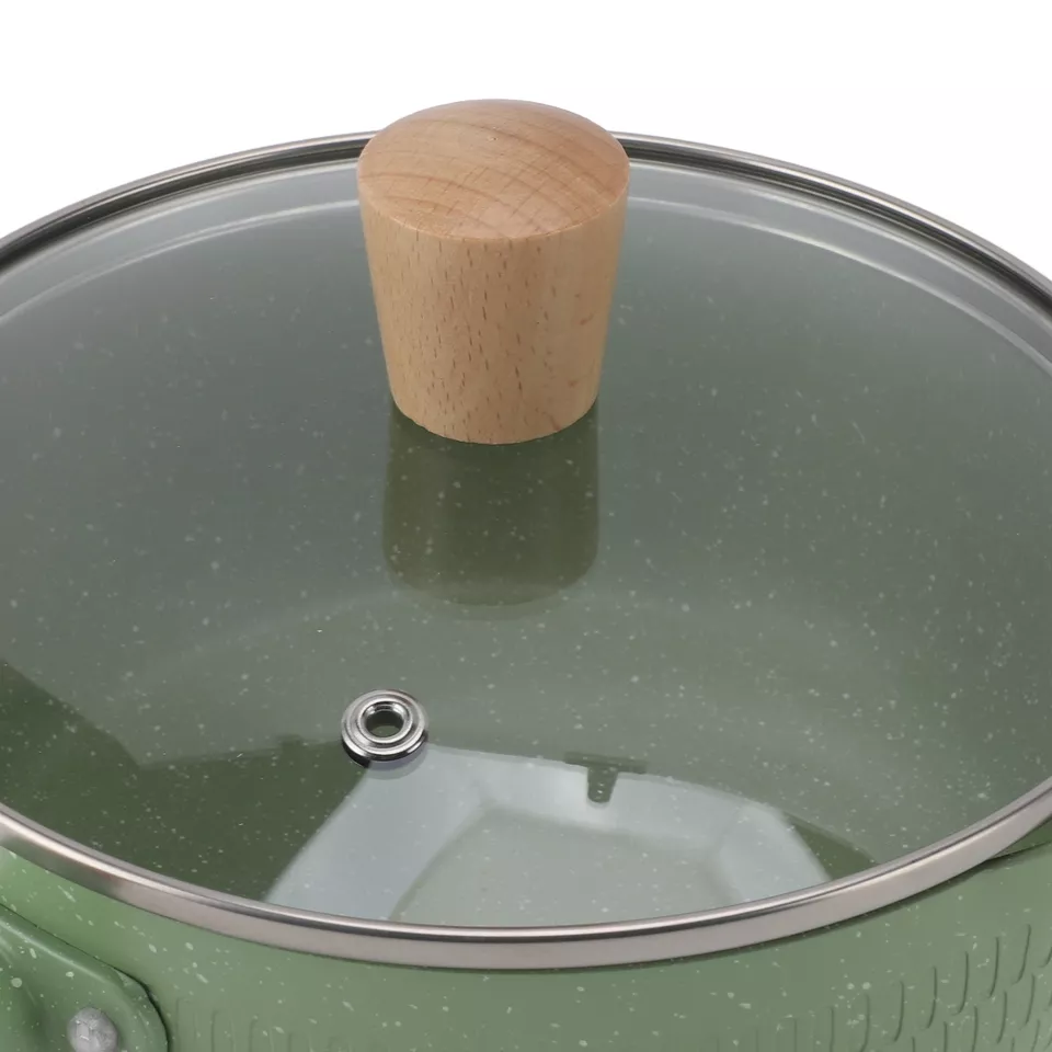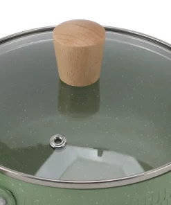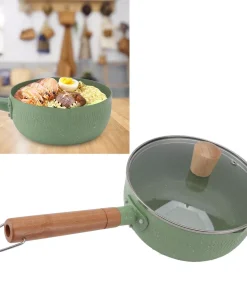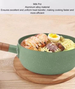 Elevate your cooking with the Wooden Handle Milk Pot. This green, flat-bottomed noodle and sauce pan comes with a lid and features an ergonomic wooden handle for comfortable use and a stylish touch.